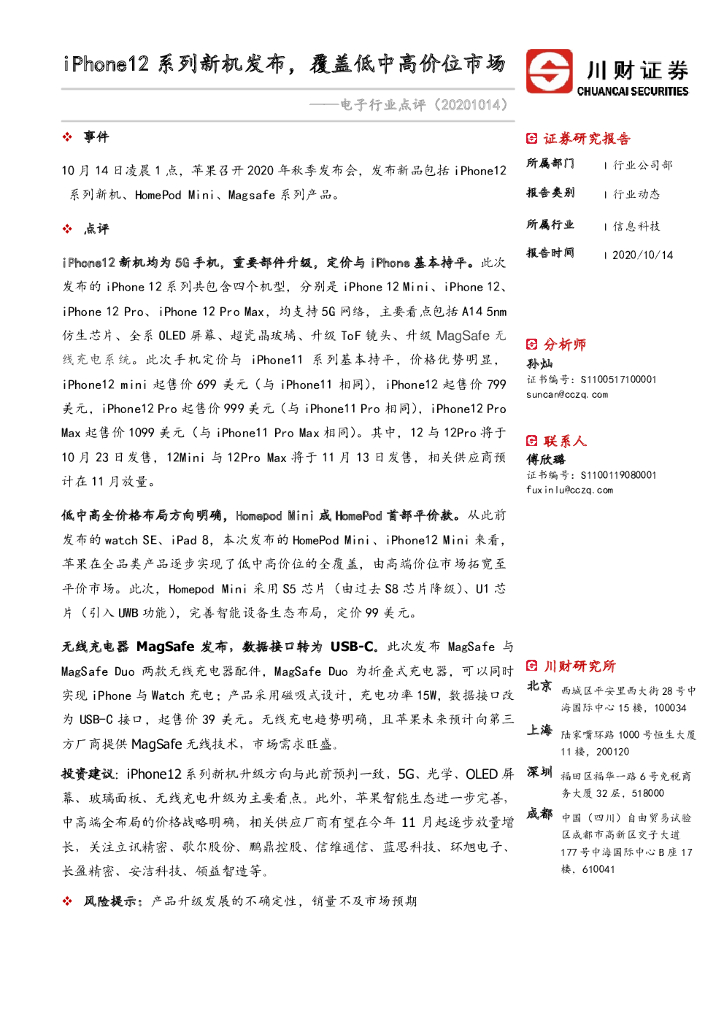 川财证券:电子行业点评:iPhone12系列新机发布,覆盖低中高价位市场.pdf