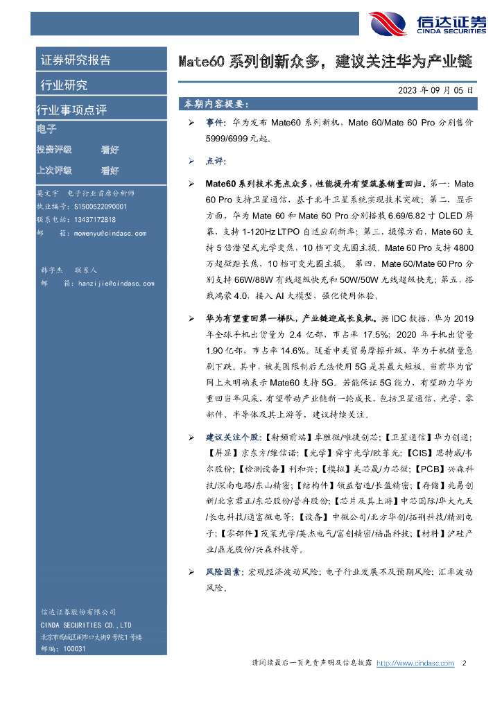 信达证券:电子行业事项点评:Mate60系列创新众多,建议关注华为产业链.pdf
