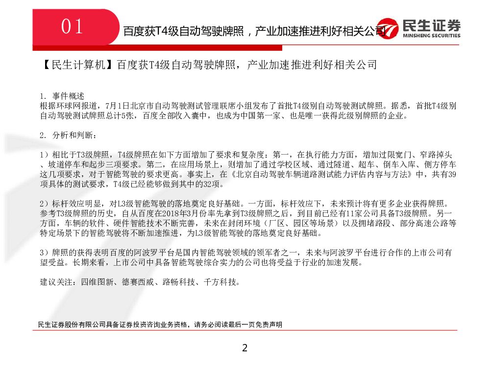 民生证券:计算机行业:百度获T4级自动驾驶牌照,产业加速推进利好相关公司.pdf