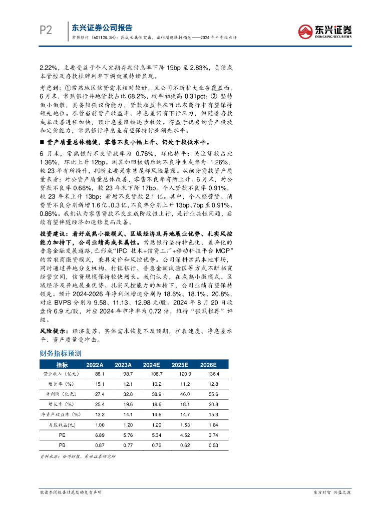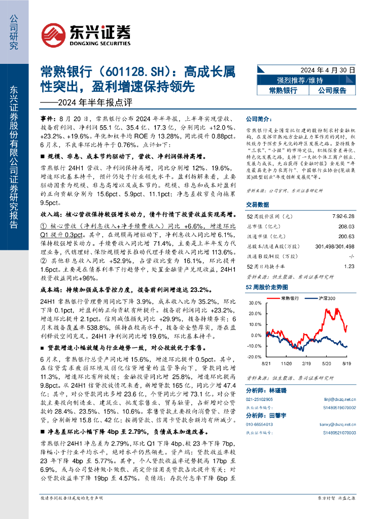 东兴证券:常熟银行(601128)-2024年半年报点评:高成长属性突出,盈利增速保持领先.pdf
