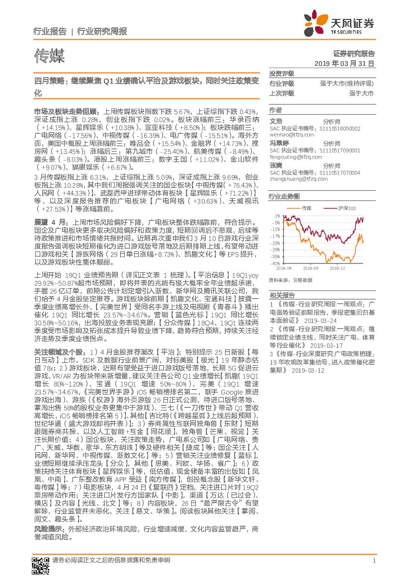 天风证券:传媒行业研究周报:四月策略:继续聚焦Q1业绩确认平治及游戏板块,同时关注政策变化.pdf