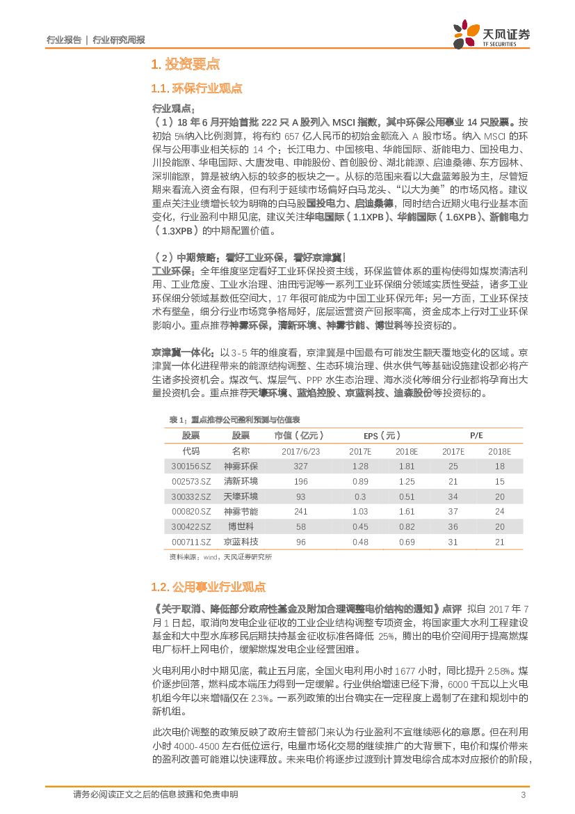 天风证券:公用事业行业研究周报:板块多个标的纳入MSCI指数,看好工业环保和京津冀; 燃煤上网电价7月上调 ,火电行业盈利见底.pdf