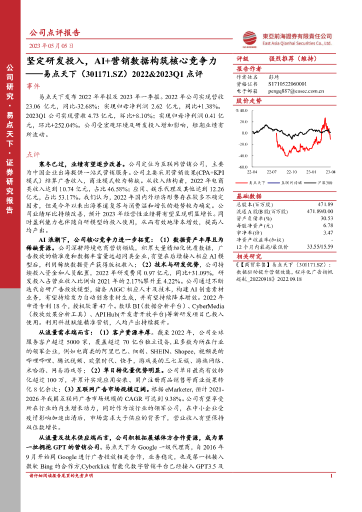 东亚前海证券:易点天下(301171)-2022&2023Q1点评:坚定研发投入,AI+营销数据构筑核心竞争力.pdf