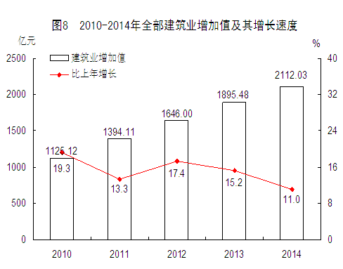 全年全社会建筑业实现增加值2112.03亿元,比上年增长11.0%。全省具有资质等级的总承包和专业承包建筑业企业完成建筑业总产值6689.21亿元,增长22.5%;实现利润227.05亿元,增长22.5%;税金总额236.08亿元,增长22.5%。