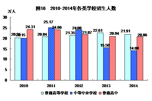 教育科技文化事业持续发展。全年全日制研究生教育招生1.25万人,在学全日制研究生3.93万人,毕业生1.09万人。普通高等教育招生21.91万人,在校生74.85万人,毕业生19.01万人。高校毕业生就业率为94.1%。中等职业教育(不含技工校)招生14.09万人,在校生43.76万人,毕业生15.21万人。成人高等教育招生6.07万人,在校生16.08万人,毕业生4.12万人。全省普通高中招生20.86万人,在校生62.91万人,毕业生22.73万人。全省普通初中招生37.17万人,在校生112.57万人,毕业生34.31万人。普通小学招生52.95万人,在校生274.63万人,毕业生37.89万人。特殊教育在校生2.51万人。幼儿园在园幼儿145.63万人。分页标题