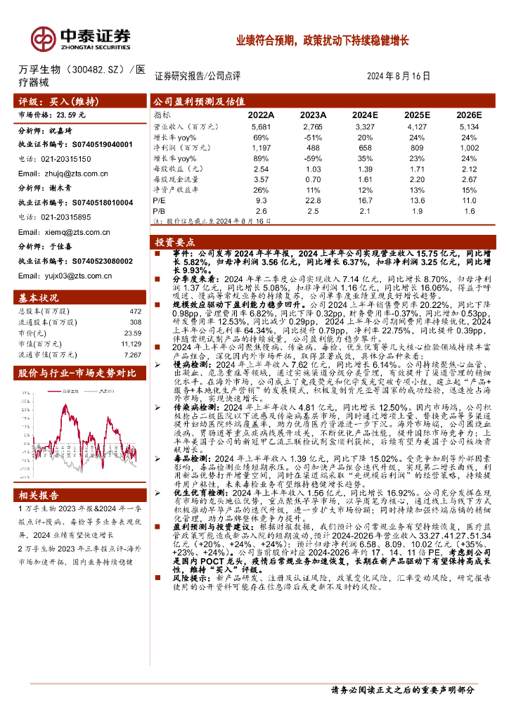 中泰证券:万孚生物(300482)-业绩符合预期,政策扰动下持续稳健增长.pdf