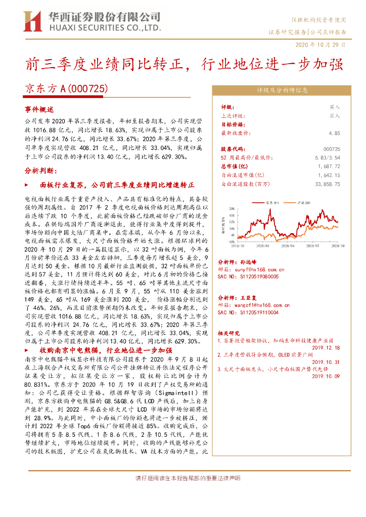 华西证券:京东方A(000725)-前三季度业绩同比转正,行业地位进一步加强.pdf