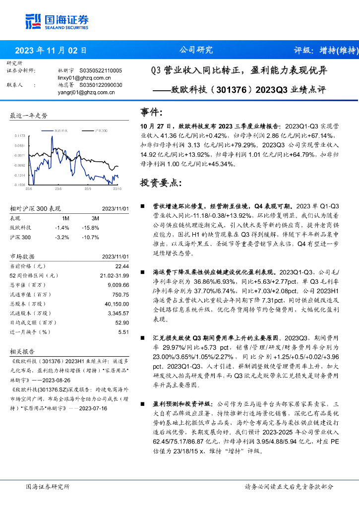 国海证券:致欧科技(301376)-2023Q3业绩点评:Q3营业收入同比转正,盈利能力表现优异.pdf