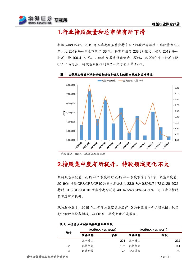 渤海证券:2019年二季度机械行业基金持股情况分析报:持股集中度有所提升,热门领域变化不大.pdf