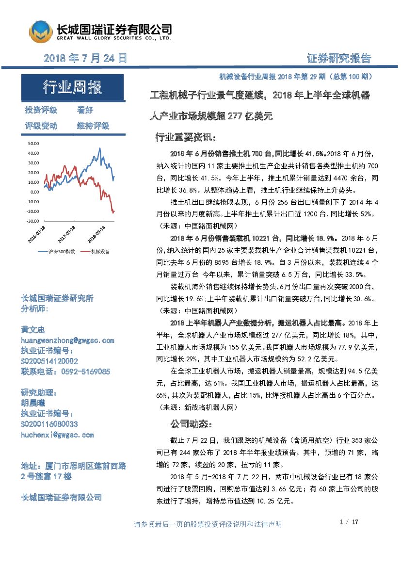 长城国瑞证券:机械设备行业周报2018年第29期(总第100期):工程机械子行业景气度延续,2018年上半年全球机器人产业市场规模超277亿美元.pdf