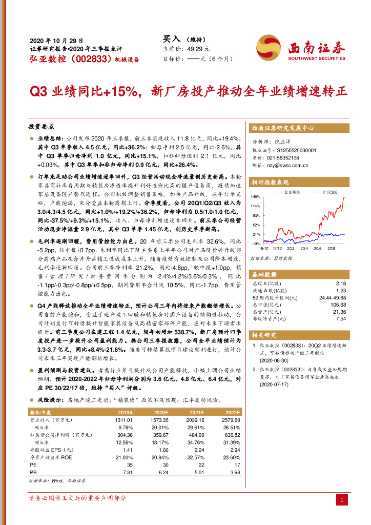 西南证券:弘亚数控(002833)-Q3业绩同比+15%,新厂房投产推动全年业绩增速转正.pdf