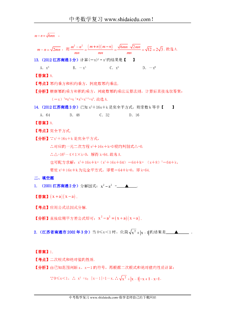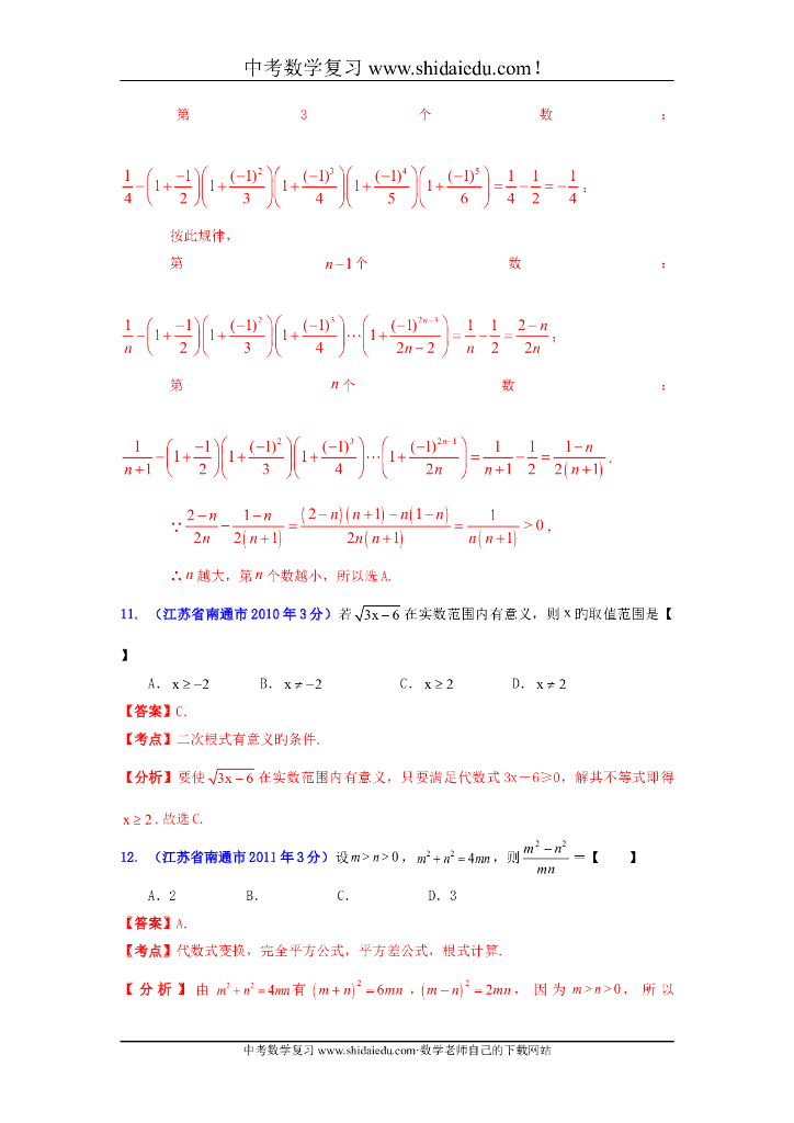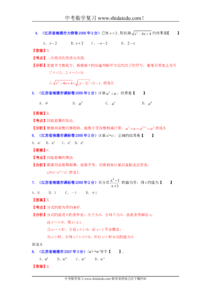 江苏南通-中考数学试题分类解析专题2:代数式和因式分解.doc