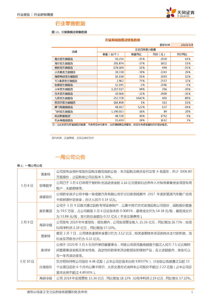 天风证券:家用电器2020W10周观点:2月中怡康数据出炉,三大白电销量同比均下滑.pdf