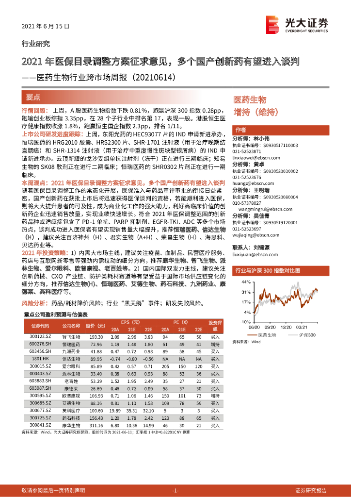 光大证券:医药生物行业跨市场周报:2021年医保目录调整方案征求意见,多个国产创新药有望进入谈判.pdf