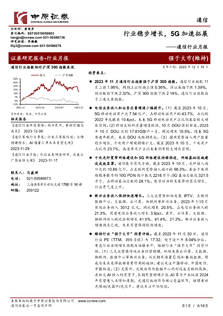 中原证券:通信行业月报:行业稳步增长,5G加速拓展.pdf