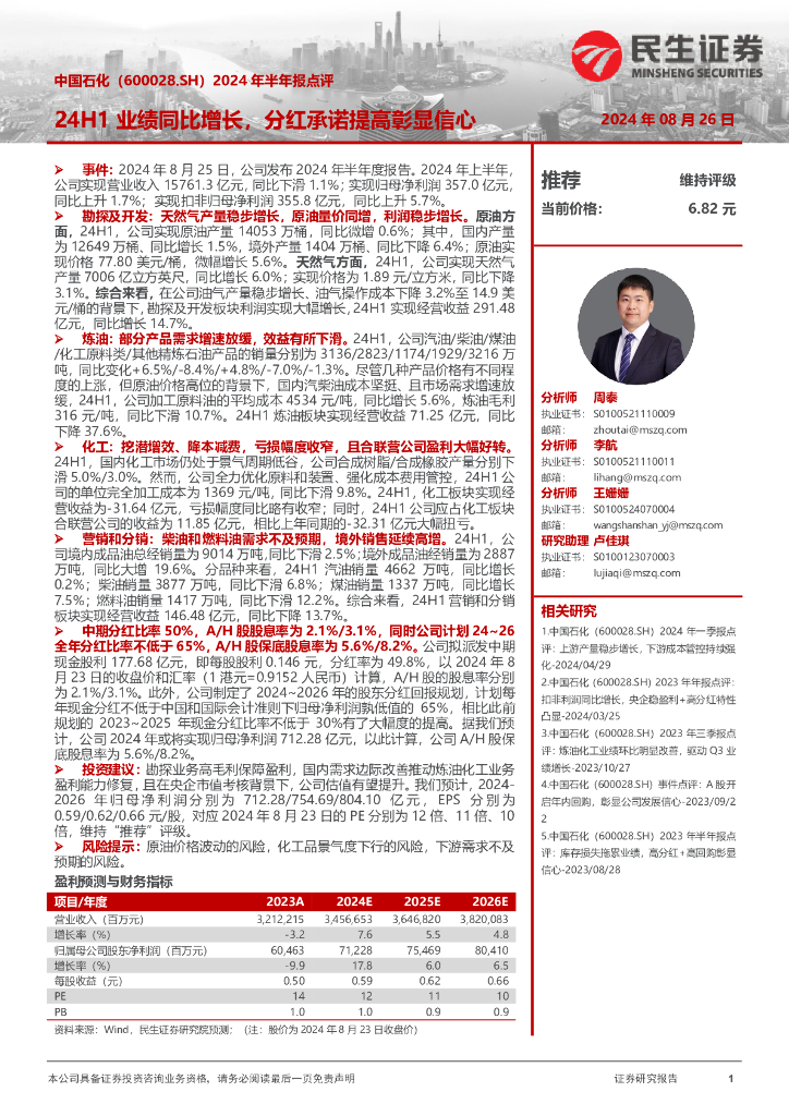 民生证券:中国石化(600028)-2024年半年报点评:24H1业绩同比增长,分红承诺提高彰显信心.pdf