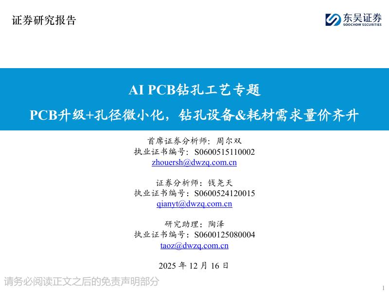 东吴证券:AIPCB钻孔工艺专题:PCB升级+孔径微小化,钻孔设备&耗材需求量价齐升.pdf