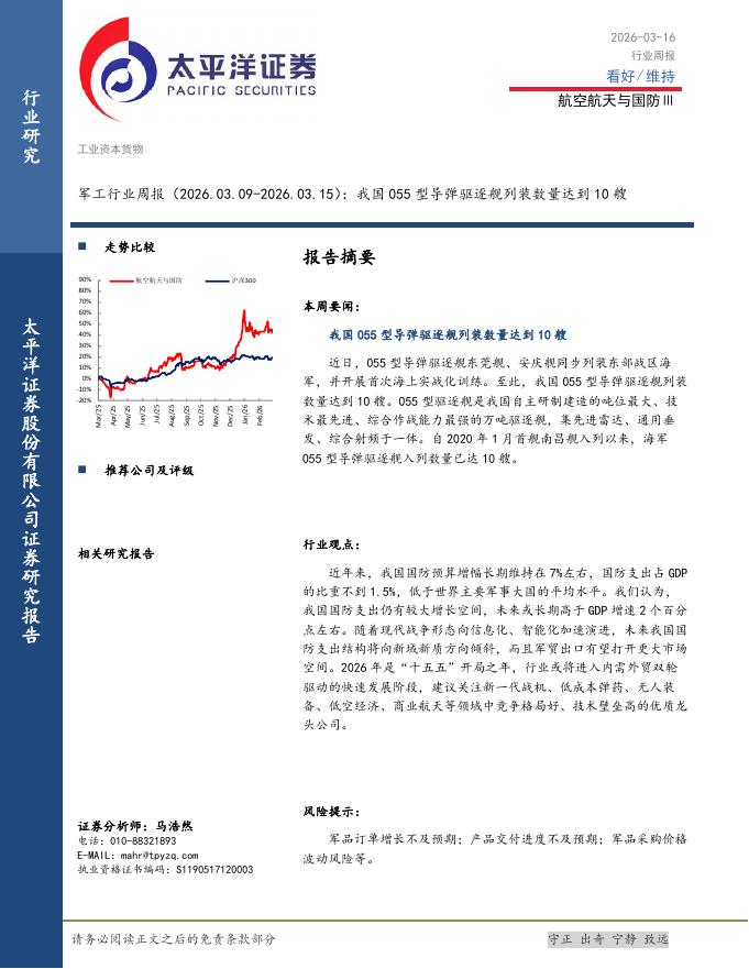 太平洋证券:军工行业周报:我国055型导弹驱逐舰列装数量达到10艘.pdf