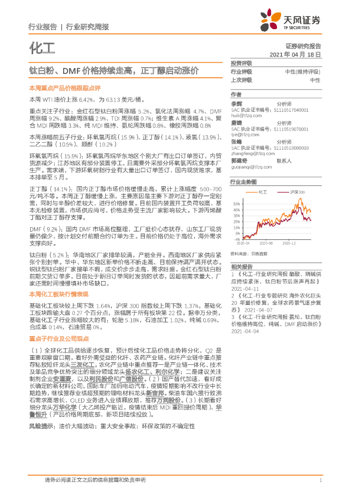 天风证券:化工行业研究周报:钛白粉、DMF价格持续走高,正丁醇启动涨价.pdf