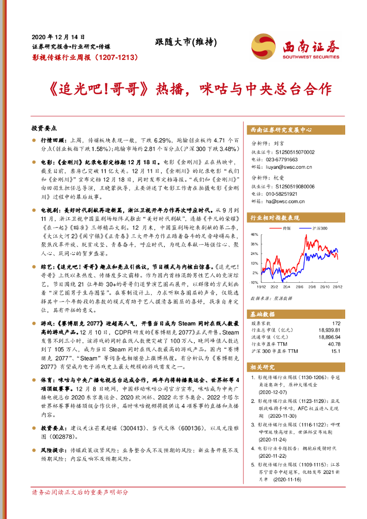 西南证券:影视传媒行业周报:《追光吧!哥哥》热播,咪咕与中央总台合作.pdf
