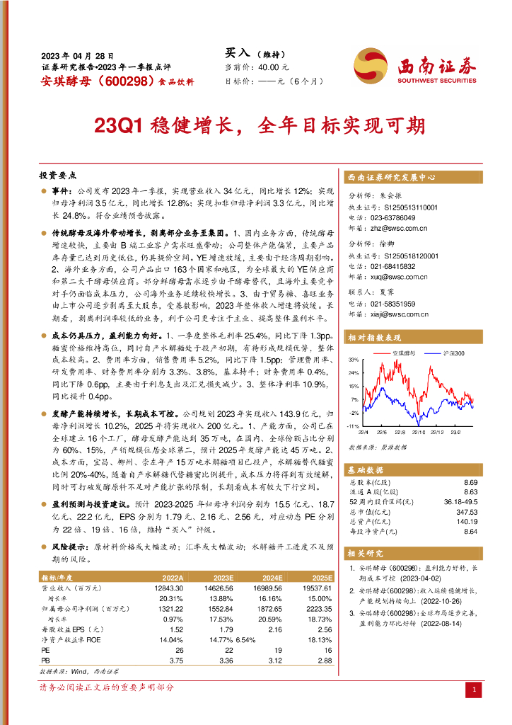 西南证券:安琪酵母(600298)-23Q1稳健增长,全年目标实现可期.pdf