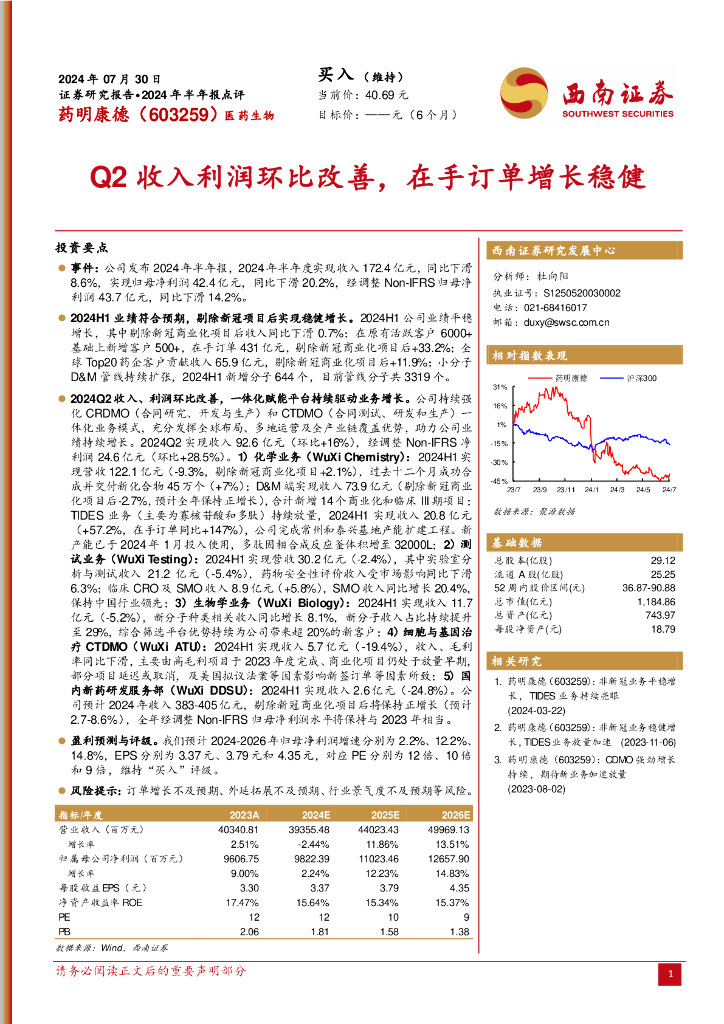西南证券:药明康德(603259)-Q2收入利润环比改善,在手订单增长稳健.pdf
