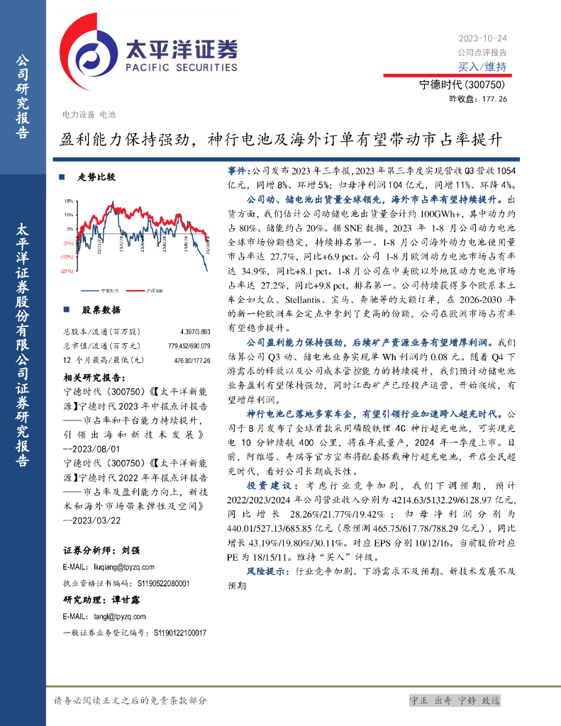 太平洋证券:宁德时代(300750)-盈利能力保持强劲,神行电池及海外订单有望带动市占率提升.pdf