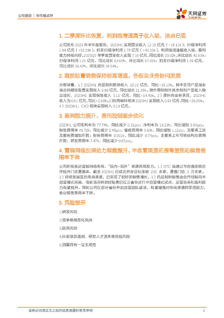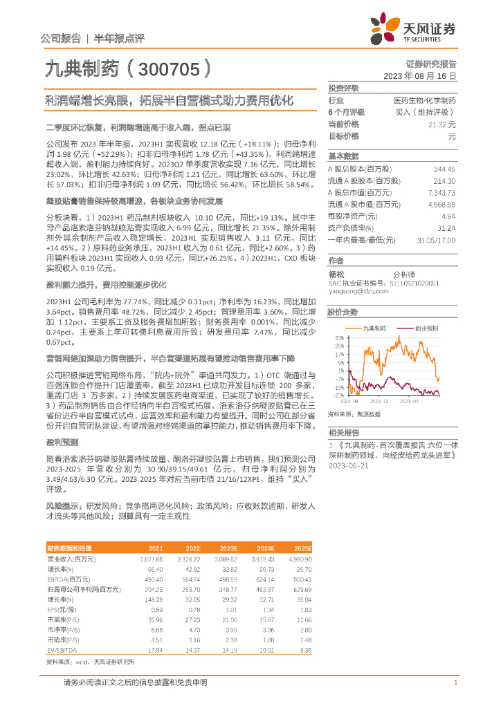 天风证券:九典制药(300705)-利润端增长亮眼,拓展半自营模式助力费用优化.pdf