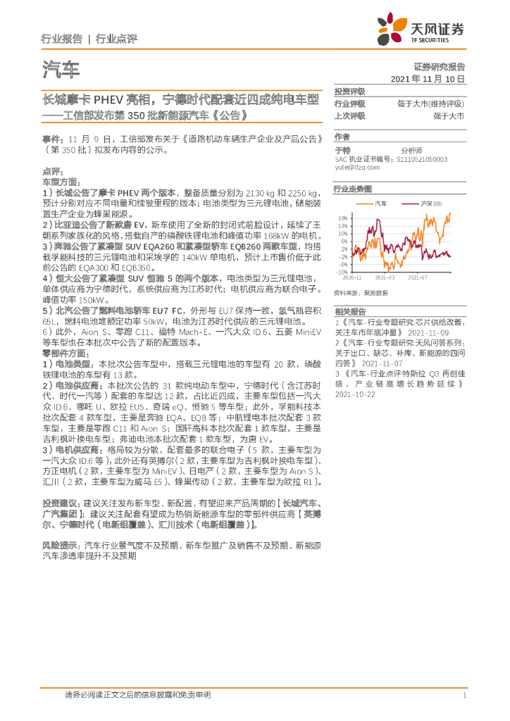 天风证券:汽车行业工信部发布第350批新能源汽车《 公告》:长城摩卡PHEV亮相,宁德时代配套近四成纯电车型.pdf