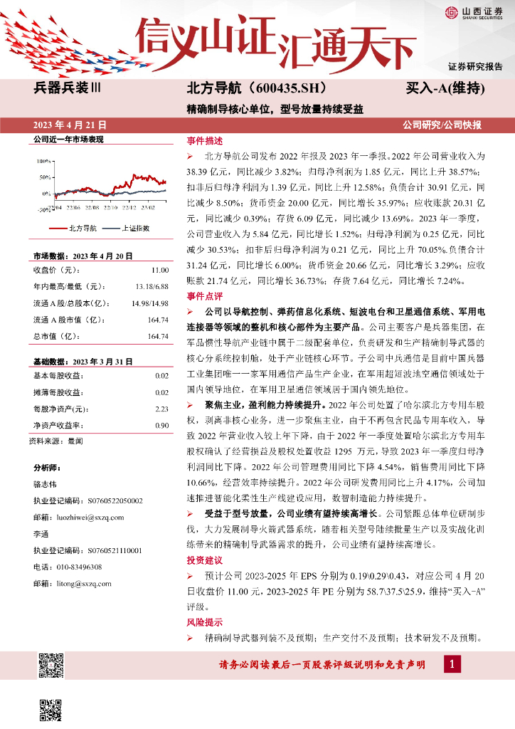 山西证券:北方导航(600435)-精确制导核心单位,型号放量持续受益.pdf