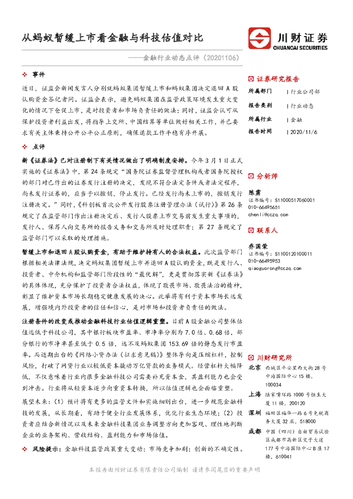 川财证券:金融行业动态点评:从蚂蚁暂缓上市看金融与科技估值对比.pdf
