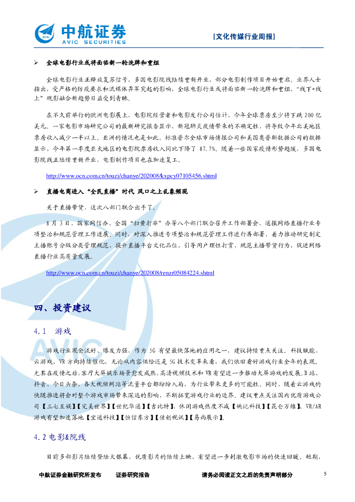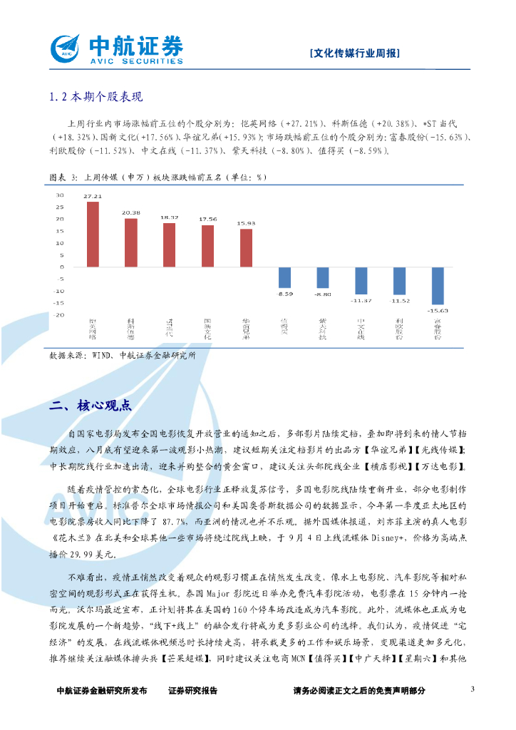 中航证券:文化传媒行业周报:全球影院陆续复工,“线上+线下”融合发行大势所趋.pdf
