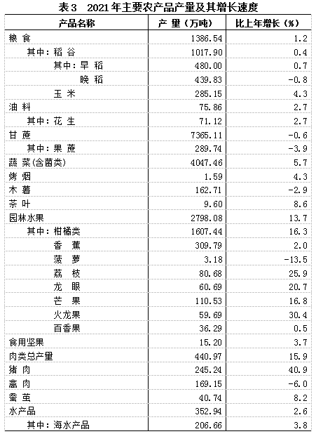 全年油料产量75.86万吨,比上年增长2.7%。甘蔗产量7365.11万吨,下降0.6%。蔬菜产量(含食用菌)4047.46万吨,增长5.7%。园林水果产量2798.08万吨,增长13.7%。