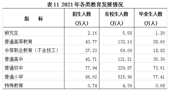 全年研究生教育招生2.16万人,在校研究生5.58万人,毕业生1.20万人。普通高等教育招生43.77万人,在校生132.10万人,毕业生28.60万人。各类中等职业教育(不含技工)招生27.23万人,在校生69.09万人,毕业生18.82万人。普通高中招生42.71万人,在校生121.21万人,毕业生35.30万人。普通初中招生77.94万人,在校生229.87万人,毕业生73.61万人。普通小学招生86.02万人,在校生515.96万人,毕业生77.41万人。特殊教育招生0.74万人,在校生4.39万人,毕业生0.68万人。学前教育在园幼儿227.51万人。九年义务教育巩固率为96.5%,高中阶段毛入学率为92.0%。