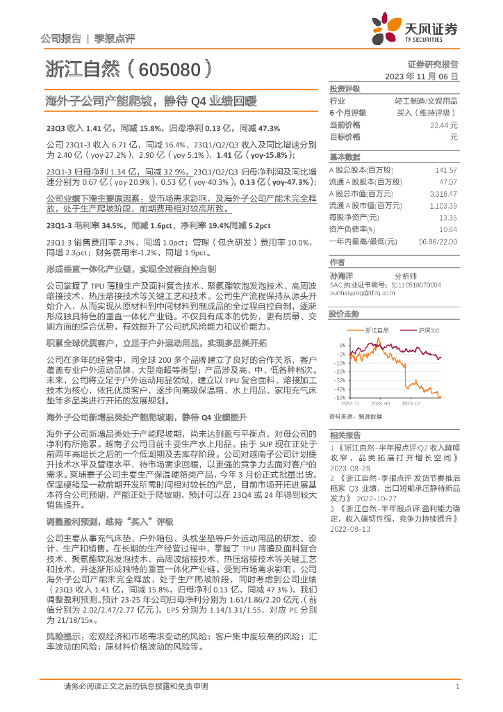 天风证券:浙江自然(605080)-海外子公司产能爬坡,静待Q4业绩回暖.pdf