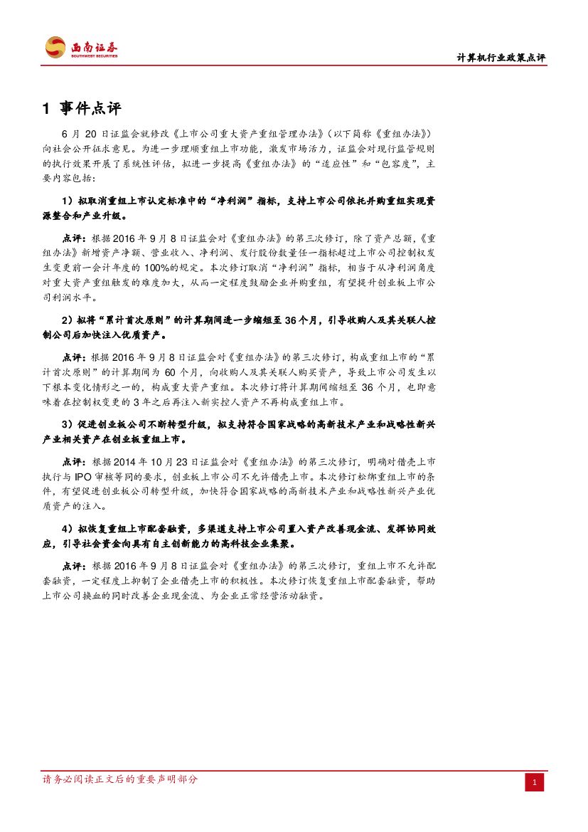 西南证券:计算机行业政策点评:重组新规释放制度红利,预期有望提振市场活力.pdf