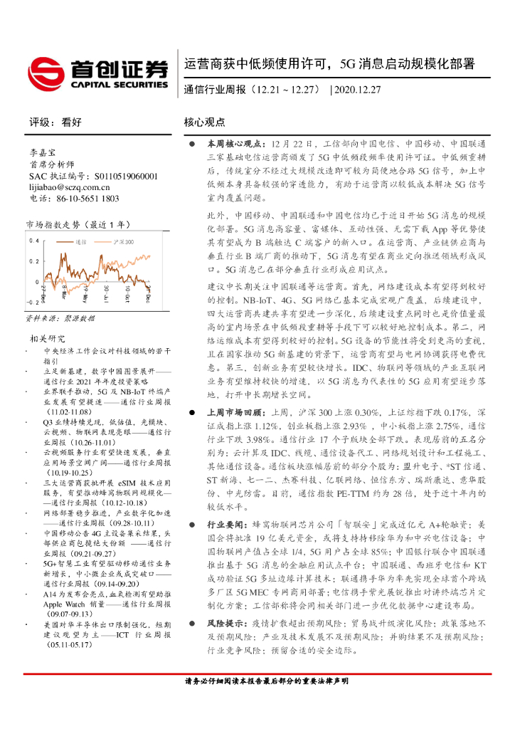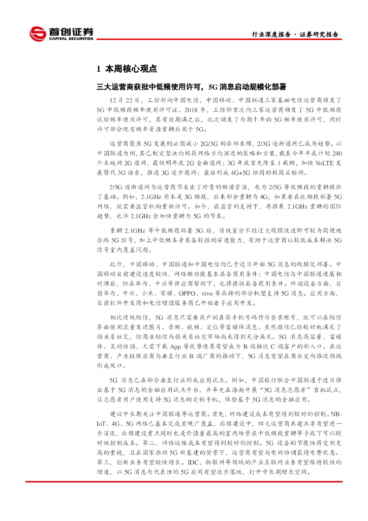 首创证券:通信行业周报:运营商获批中低频使用许可,5G消息启动规模化部署.pdf