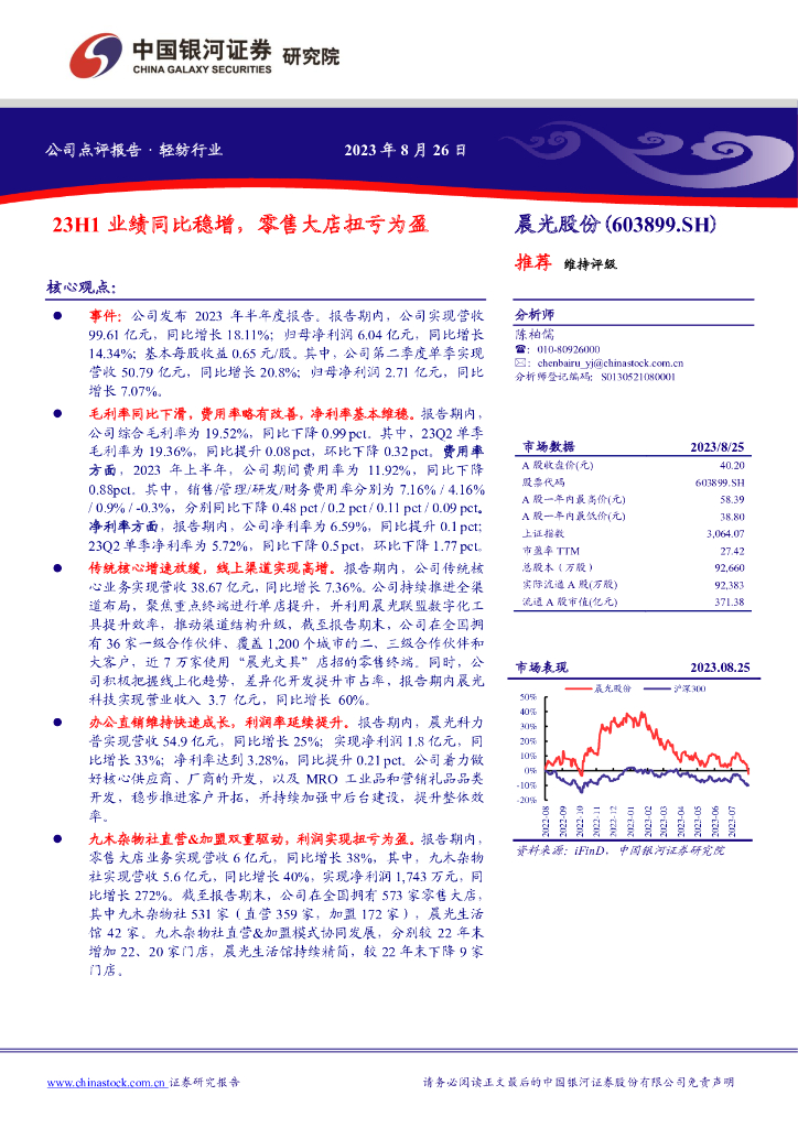 中国银河:晨光股份(603899)-23H1业绩同比稳增,零售大店扭亏为盈.pdf