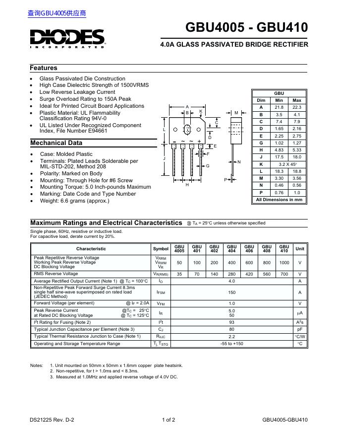 DIODES GBU4005 - GBU410 数据手册.pdf