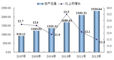 图1 2007-2012年全区生产总值及其增长速度 单位:亿元、%