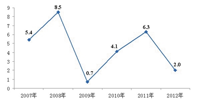 图3 2007-2012年全区居民消费价格涨跌幅度(%)