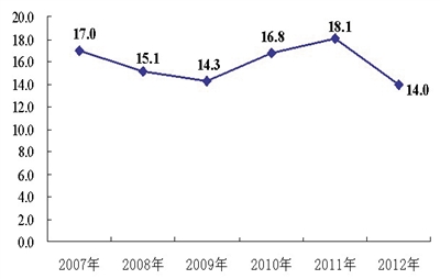 图5 2007-2012年全区规模以上工业增加值增长速度(%)