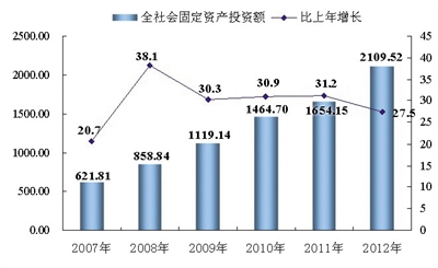 图6 2007-2012年全区全社会固定资产投资总额及增长速度 单位:亿元、%分页标题