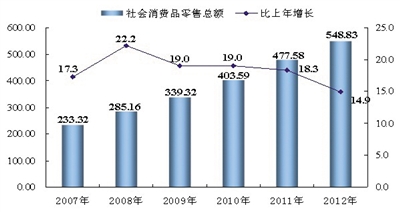 图7 2007-2012年全区社会消费品零售总额及增长速度单位:亿元、%