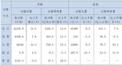 年末铁路营业里程1029.3公里。公路通车里程26522公里,增长8.2%。高速公路里程1323.6公里,比上年增长1.3%。全年各种运输方式完成货物周转量1101.99亿吨公里,增长14.6%;完成旅客周转量144.10亿人公里,增长7.6%;机场旅客吞吐量380.96万人,增长12.8%。