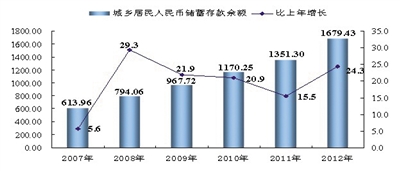 图9 2007-2012年城乡居民人民币储蓄存款余额及增长速度。单位:亿元、%