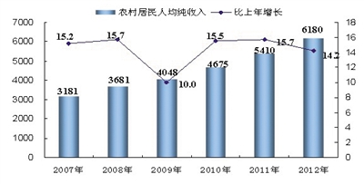 图10 2007-2012年全区农民人均纯收入及增长速度。单位:元、%