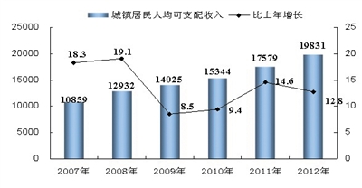 图11 2007-2012年全区城镇居民人均可支配收入及增长速度。单位:元、%
