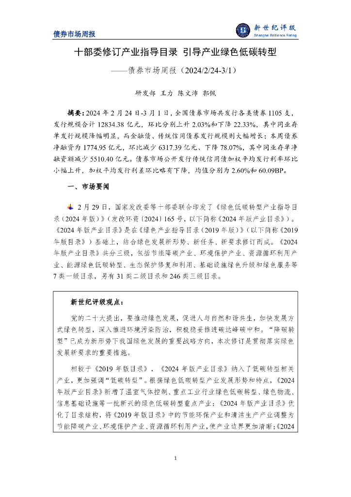 新世纪评级:十部委修订产业指导目录 引导产业绿色低碳转型——债券市场周报(2024/2/24-3/1).pdf