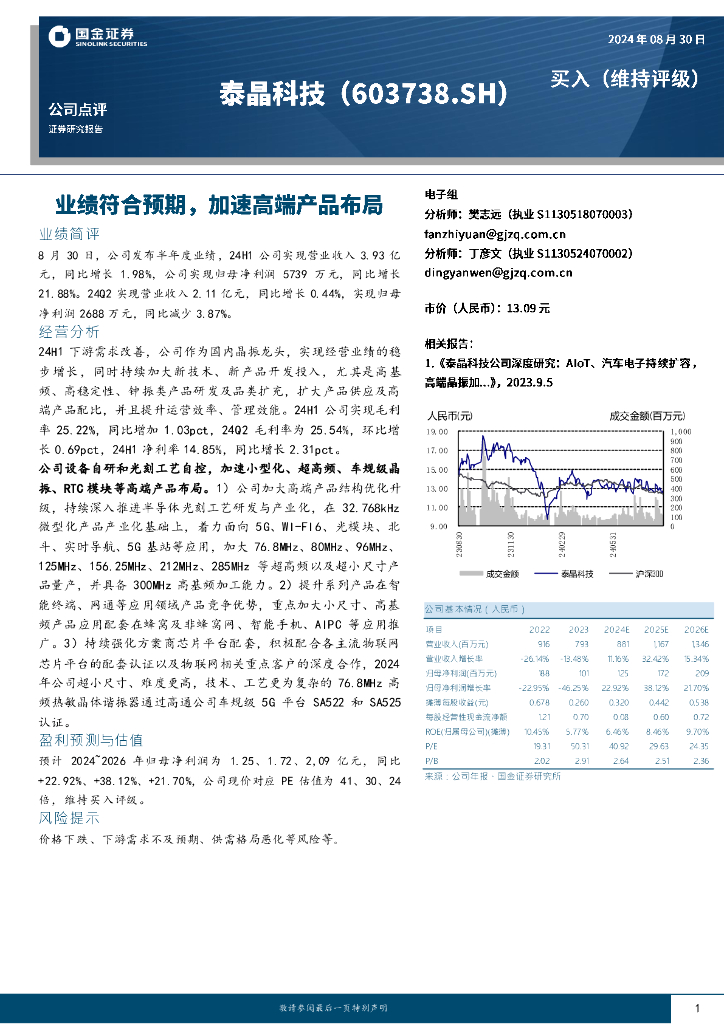 国金证券:泰晶科技(603738)-业绩符合预期,加速高端产品布局.pdf